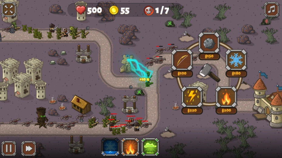 - ⚡ Заклинания и улучшения — когда становится совсем тяжело, используйте магию и прокачивайте башни.